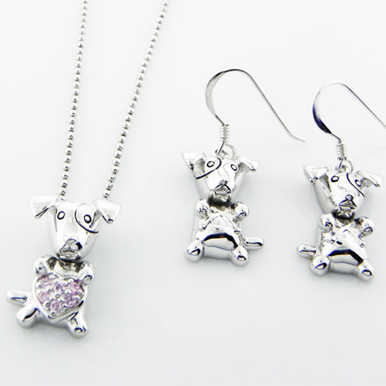 Displayed is a 925 sterling silver jewelry set that includes a pendant and a pair of earrings. They feature an adorable dog-shape design with CZ stones as a decoration. This delicate silver jewelry set makes a great gift choice for ladies.