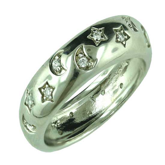 This refined 925 rhodium-finished silver ring flaunts a simple yet sophisticated design. Engraved with moons and stars with sparkling crystals, this sterling silver ring showcases a refined touch. It is an ideal accessory for elegant ladies.