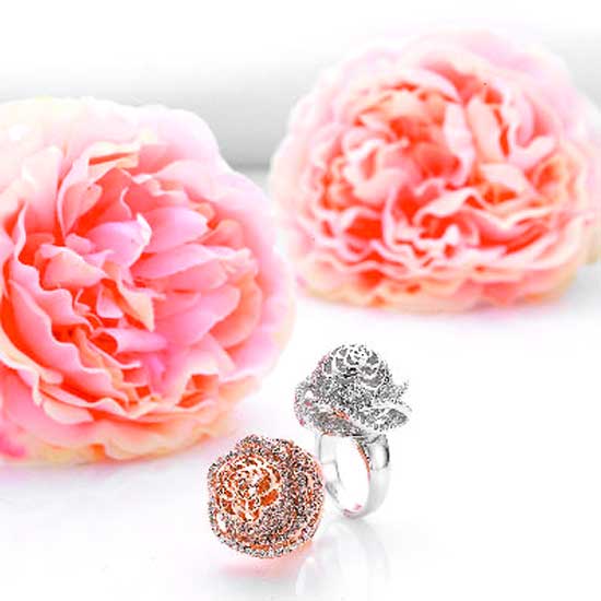 This is a sterling silver ring that comes with a rose-shape centerpiece. With excellent craftsmanship, this ring looks elegant and fashionable. This sterling silver ring is embellished with CZ stones for a sparkling effect.