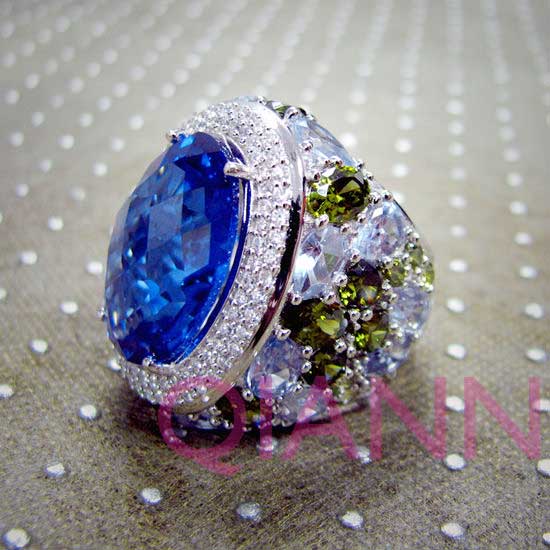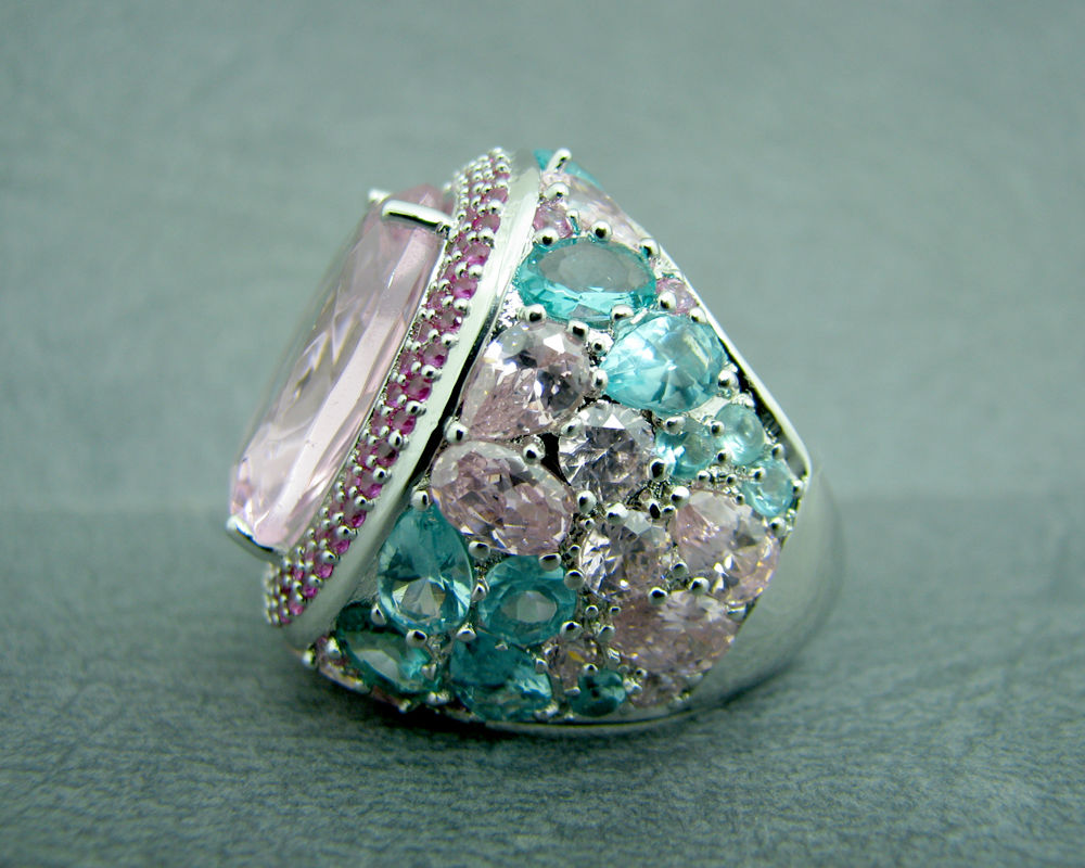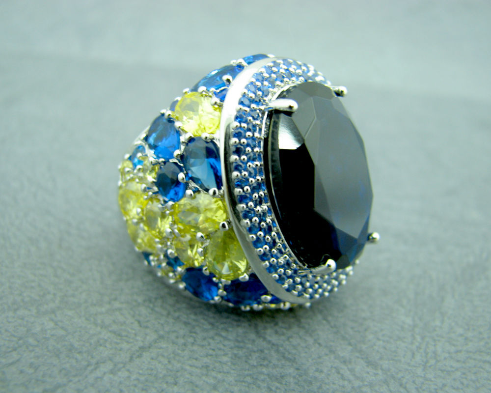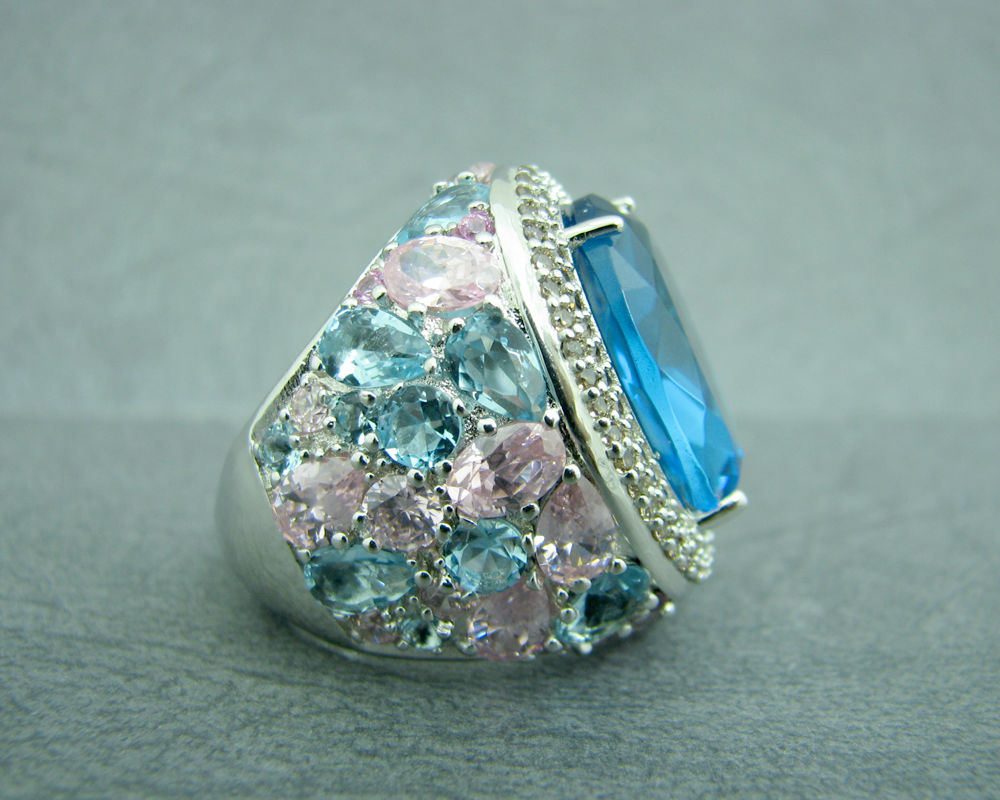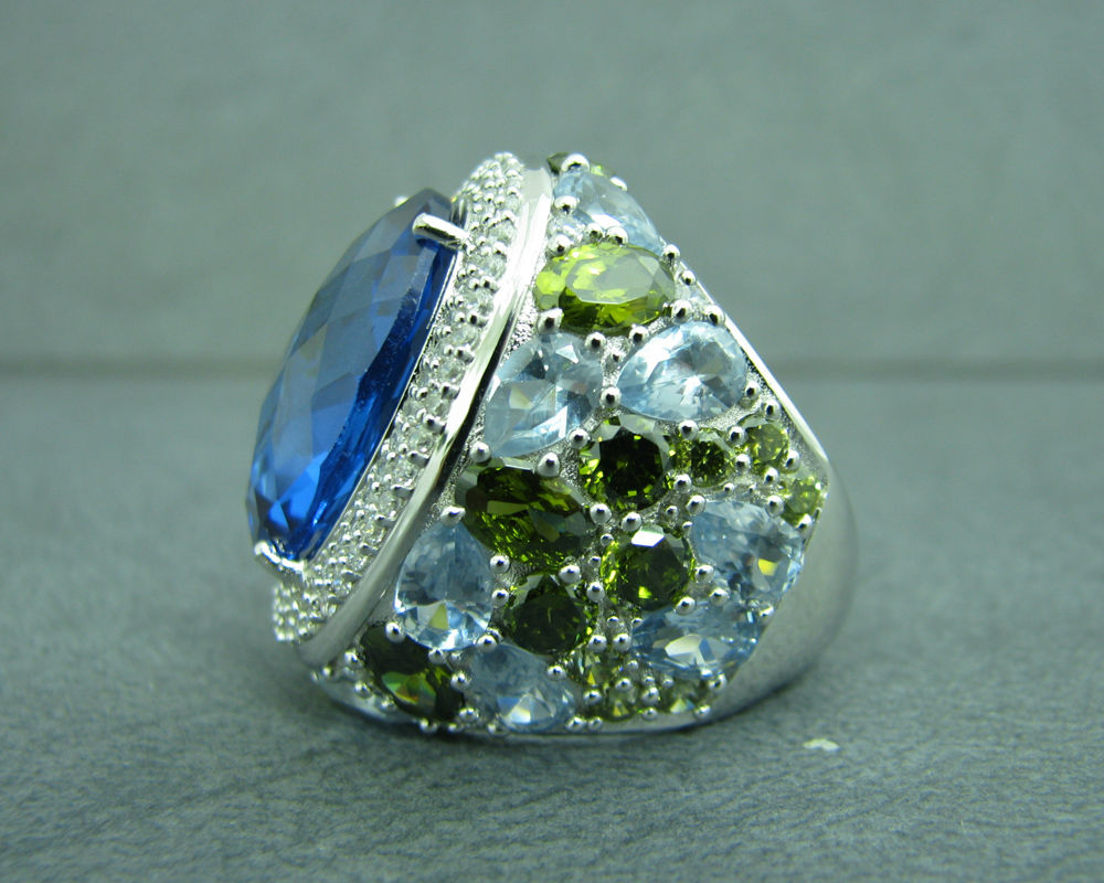 Silver cocktail ring with blue spinel center stone, mixed colors cubic zirconia and glass stone options.