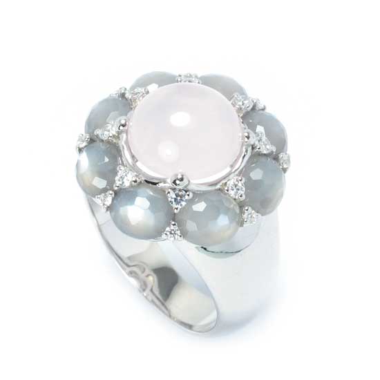 This is a sterling silver ring with a charming and elegant design. It is set with a rose quartz centerpiece which is surrounded with gray moonstones. The sparkling cubic zirconia elements add an exquisite sense to this design.