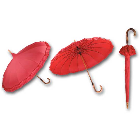 This stick umbrella exhibits a graceful design. Trimmed with ruffles, the canopy flaunts a monotone which showcase a dainty and simple design. The crooked wooden handles add extra beauty to the umbrella.