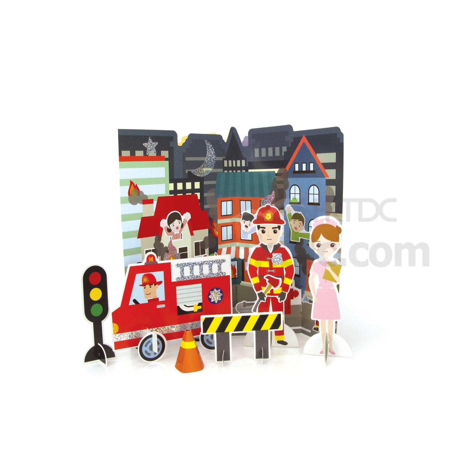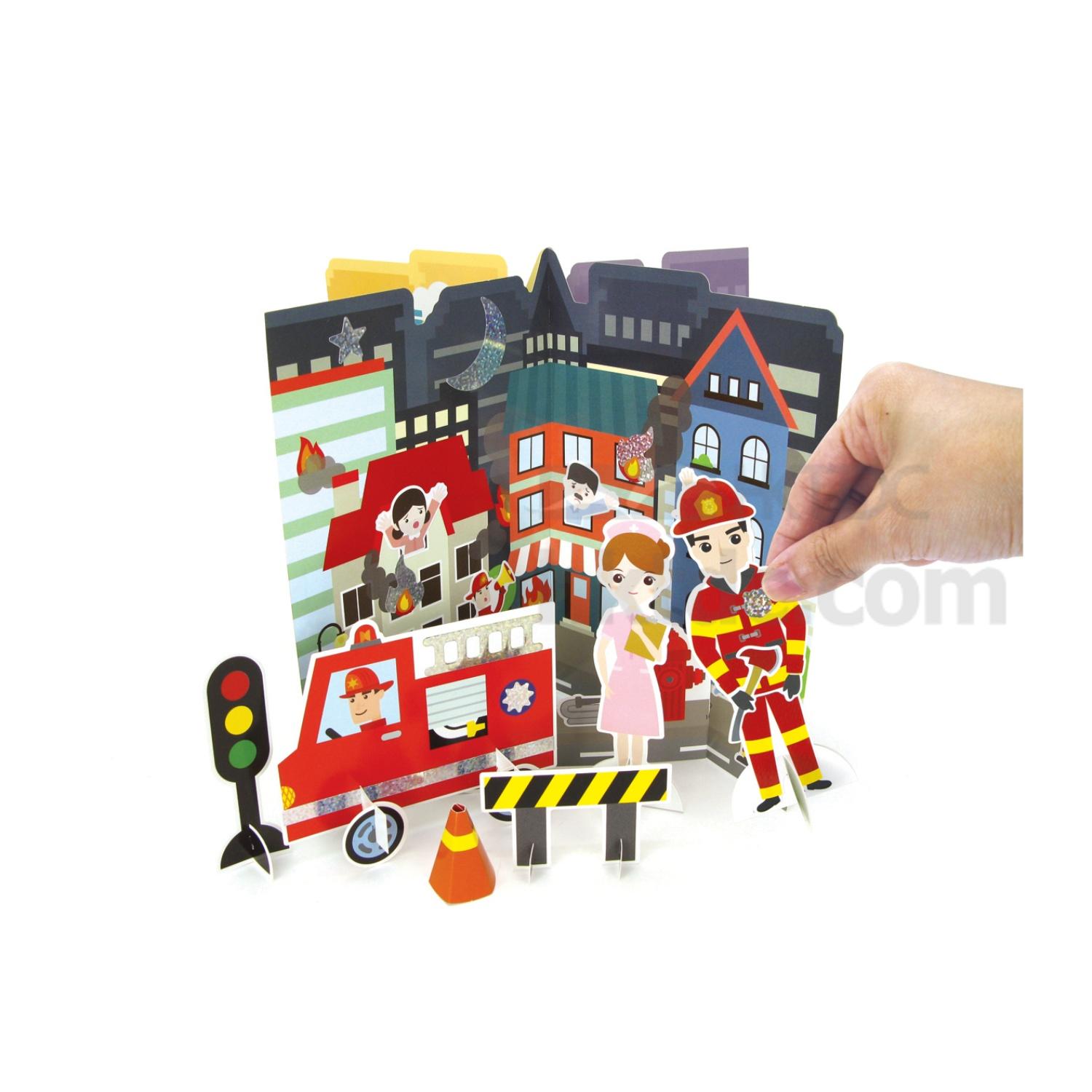 • A sticker set that features a firefighting scene with a bigger standing board and standing figurines of a nurse, firefighter, ambulance and more.