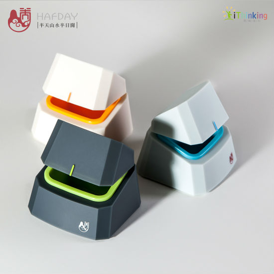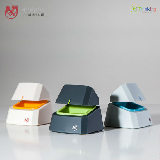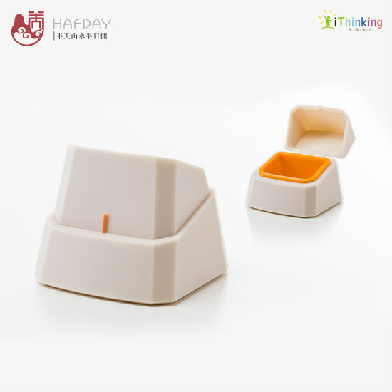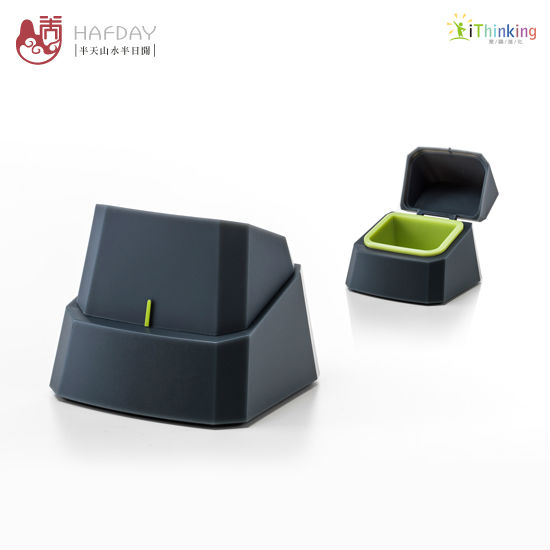 This petite desktop organizer stores odds and ends like paper clips and rubber bands with great style. It is shaped with clean lines and sharp edges resembling a rock formation. The hinged cover helps to hold the contents in place and prevents collection of dust.