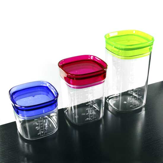 This refined jug is made of styrene acrylonitrile material. It features a colored lip and a transparent body with measuring scales for added utility. The stylish jug is available in different colors and sizes to meet your needs.