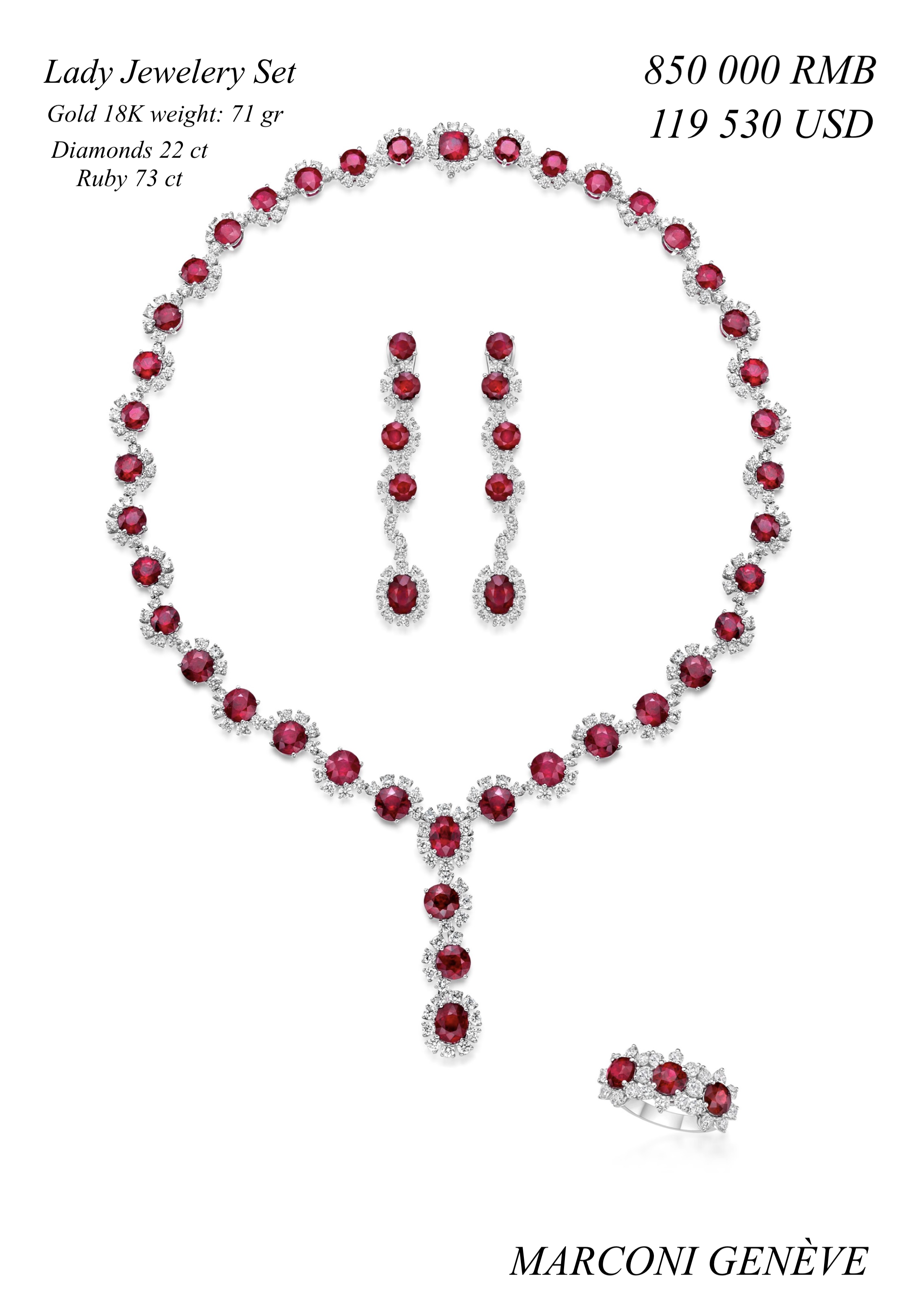 gold 18k, 71 grams, diamonds 22 carats, Ruby 73 carat