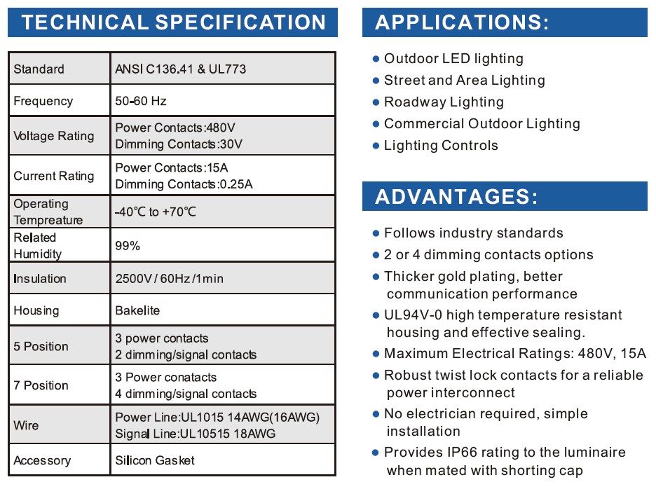 The ANSI C136.41 compliant dimming receptacle and spring leaf contacts provides an electrical and mechanical interconnection between an ANSI C136.41-2013 photo control cell and luminaire.