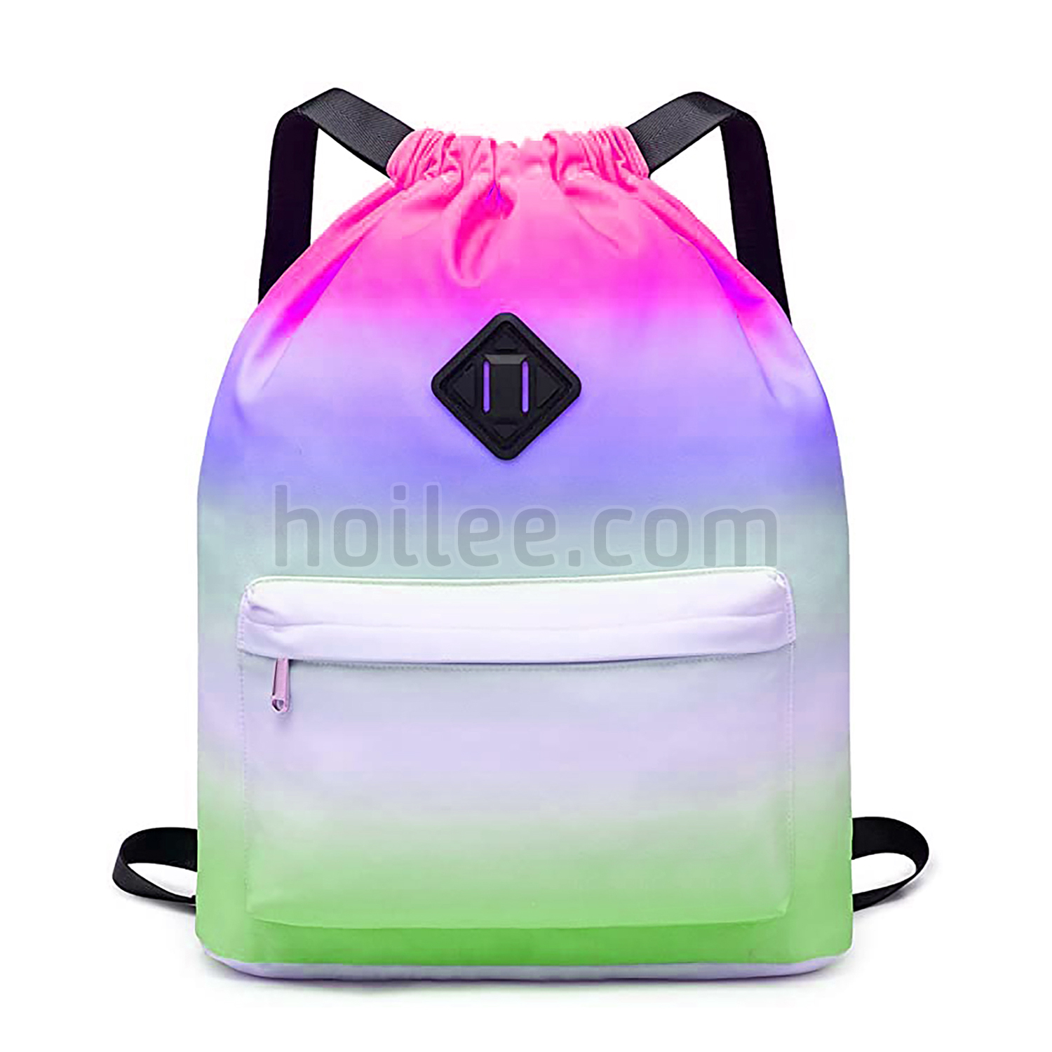 - This gym bag drawstring backpack is made of water resistant nylon and polyester, easy to clean, recyclable, water resistant, allowing you to put your towels and wet clothes in your swim bag without leaving behind. The fabric is blended with bright yarn for a more beautiful look.