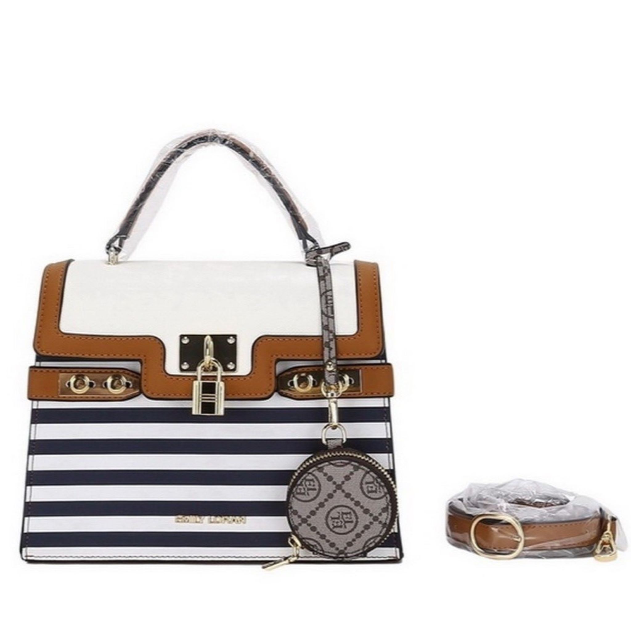 Top handle bag featuring a striped front panel and contrast flap with gold faux lock ornament, and a coin purse in monogram print. Comes with additional matching strap and the flap is secured with a magnetic closure. Please contact us directly for more details.