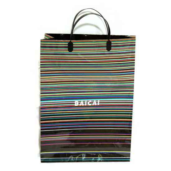 This stunning paper bag is characterized by intense stripes of various eye-catching colors, giving a sense of sophistication. With its strong plastic handles, the bag can carry heavy objects. Pack your products with this stylish paper bag.