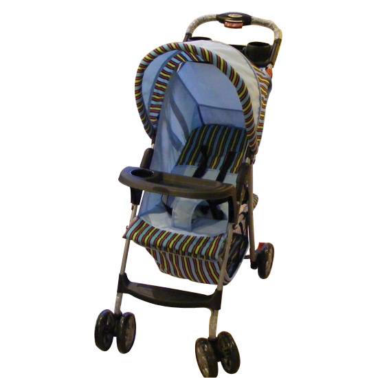 As shown is a stroller for babies aged 3 months to 3 years old. A small tray is included for placing baby food or toys on top. Double wheels in the front and single wheels at the back are designed for a smooth and easy movement.