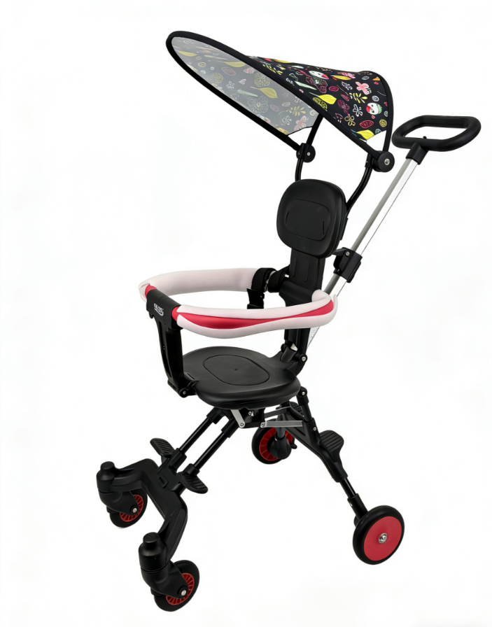 2. 结构设计:采用多轮稳定布局(前轮万向轮+后轮定向轮),车身为折叠式框架,可快速收折便于收纳携带;配备加高靠背、环形安全护栏与五点式安全带,车头设有脚踏板,车尾的推手可调节高度,适配家长操作习惯。