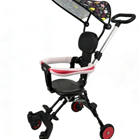 1. 外观配色:以黑色为主色调,搭配红色装饰(车轮、扶手包边)和带彩色卡通图案的遮阳棚,整体简约又不失童趣,金属支架与塑料部件结合,兼顾轻便与耐用。