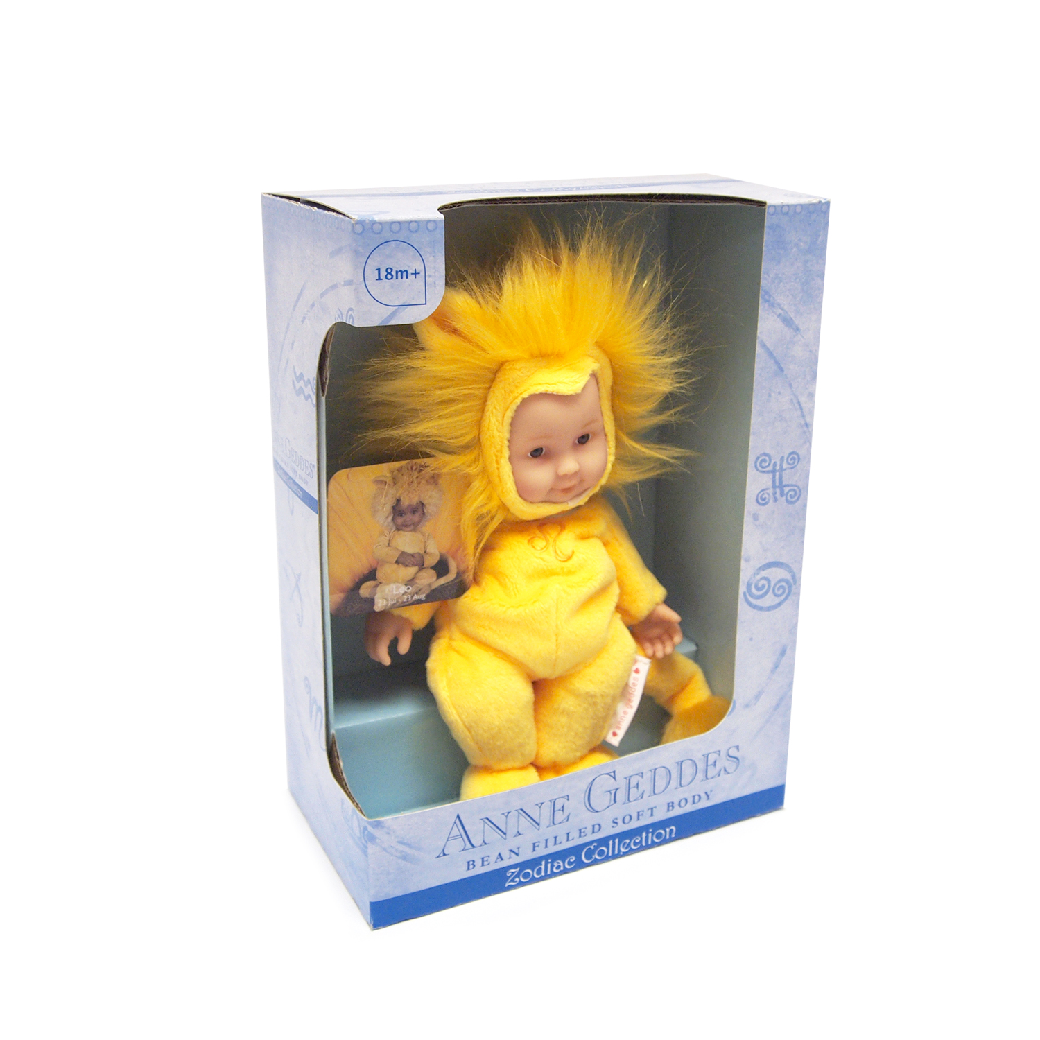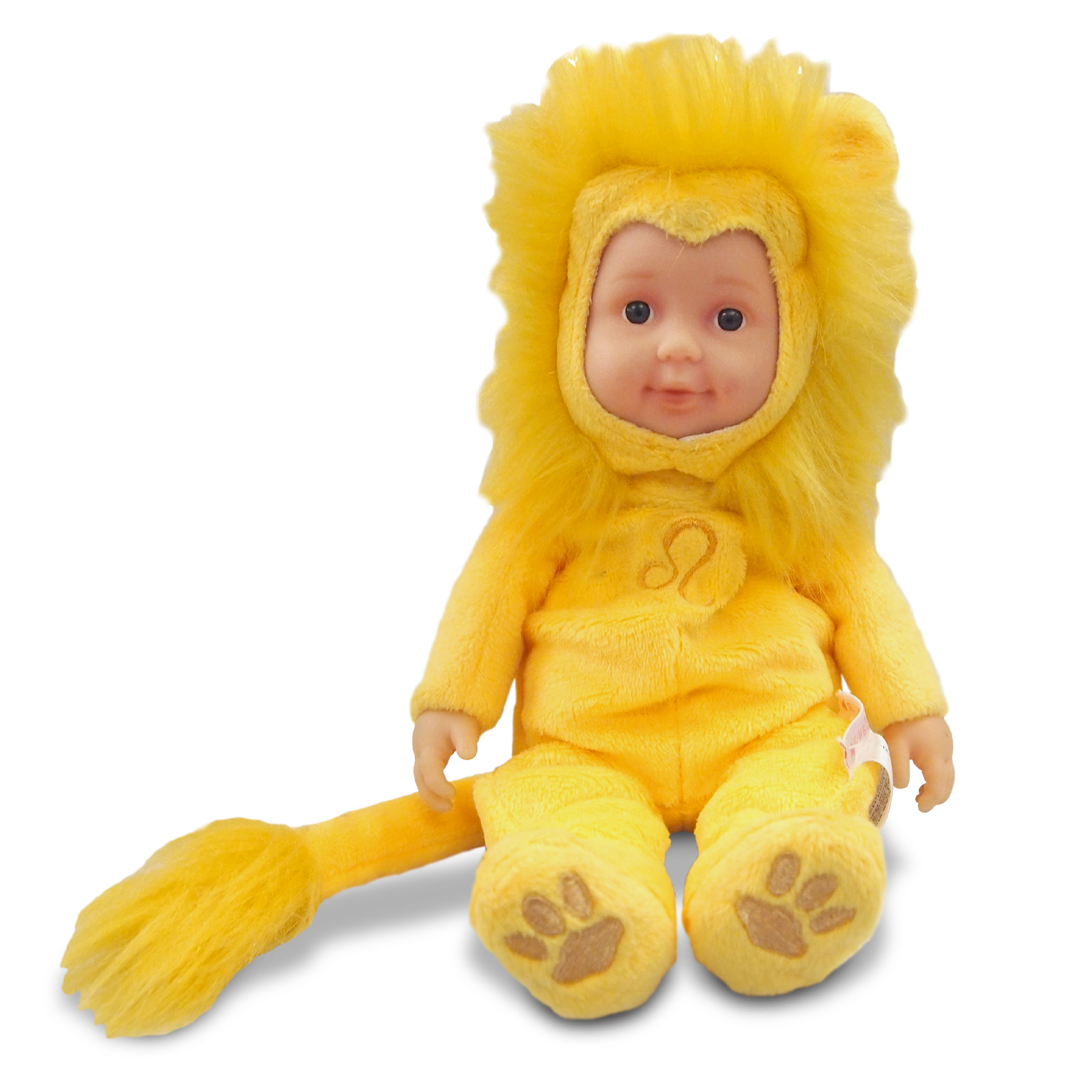 This baby doll comes in a zodiac Leo design and features a cute baby in lion overalls. The baby has a pair of large eyes and is wearing a lovely smile. It has a soft bean stuffed body and is dressed in a yellow lion costume with a furry mane.