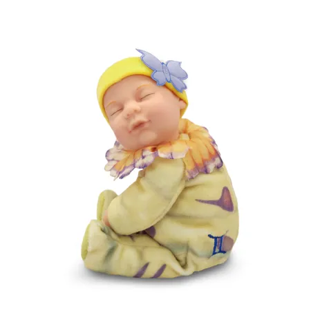 Highlighted here is a stuffed baby doll with a Gemini theme. The baby looks lovely with a chubby face, closed eyes and a pouting mouth. It is dressed in overalls with flower pedals around the neck and is wearing a cap with a butterfly ornament.