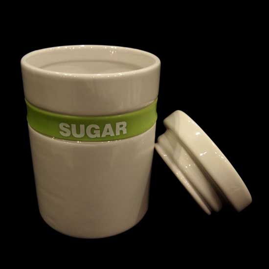 This sugar container features a simplistic design in white with a bright green band. The fitting lid effectively keeps your sugar dry and clean. This user-friendly sugar container is a basic addition to your kitchen.