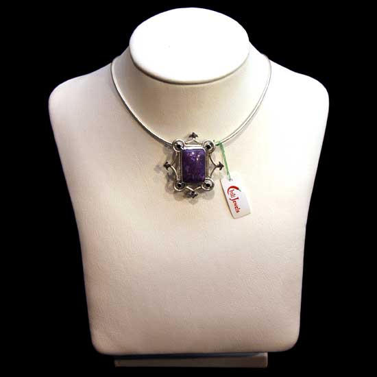 The gorgeous pendant touts a sophisticated setting, featuring a fine piece of sugilite. The precious sugilite exhibits a glow of charming purple color. Rimmed with shiny silver, the pendant delivers a touch of artistic beauty. The well-executed pendant is a perfect item to complement your jewelry collection.
