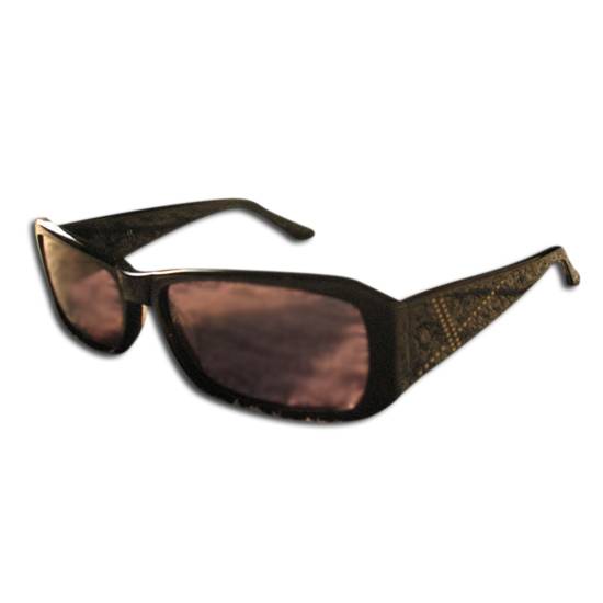 This is a pair of sunglasses. It is mainly in brown colour with small golden glitterings on its temple. These deorations makes it more stylish and feminine. The shape of the lens is rectangular. The frame of the sunglasses is bold and thick, which is the most fashionable style nowadays.