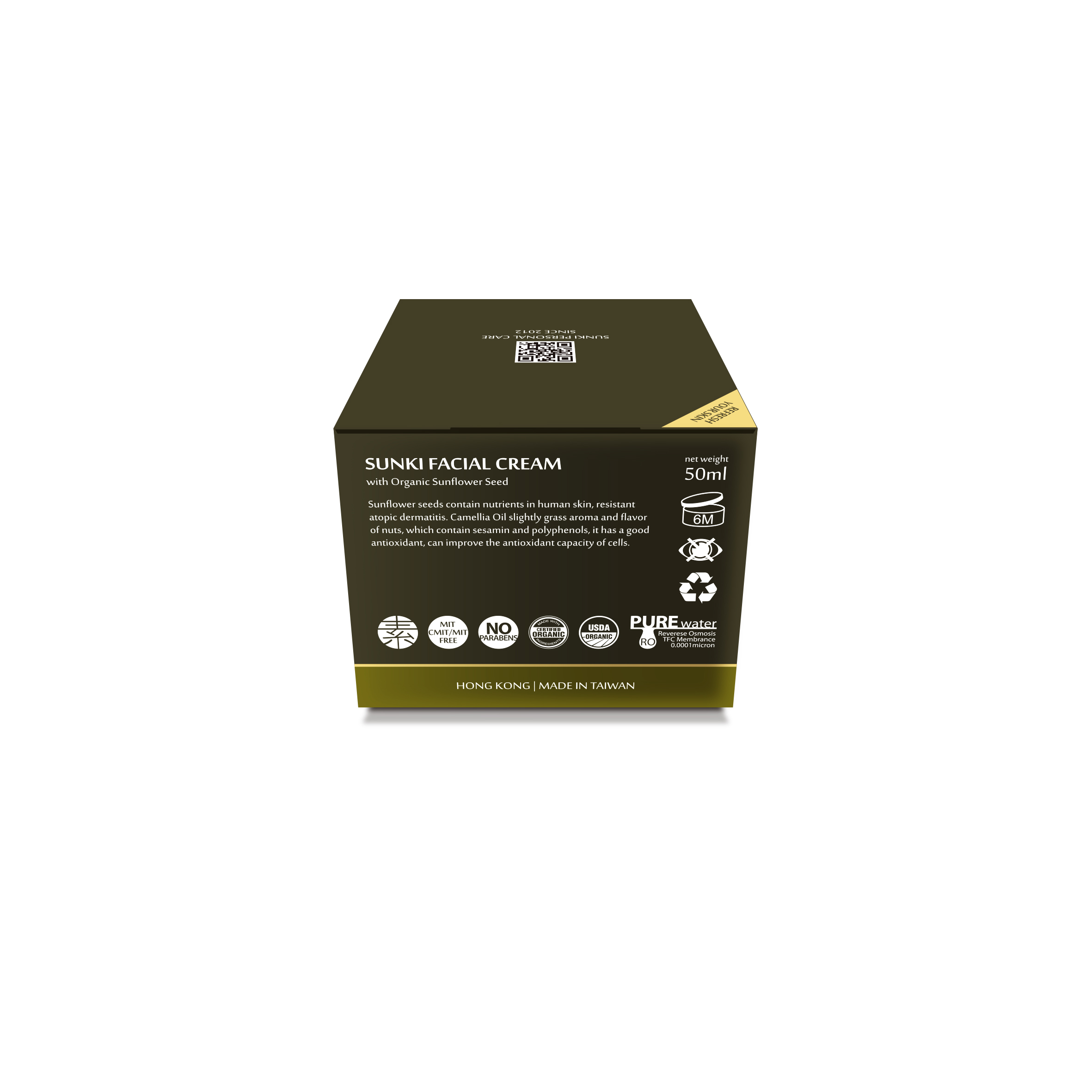 Main ingredients: Pure water, olive oil, glycerin, camellia oil, rosehip seed oil, shea butter, Coenzyme Q10, hyaluronic acid, organic Peruvian ginseng root (maca), organic sunflower seed oil, and organic lecithin.