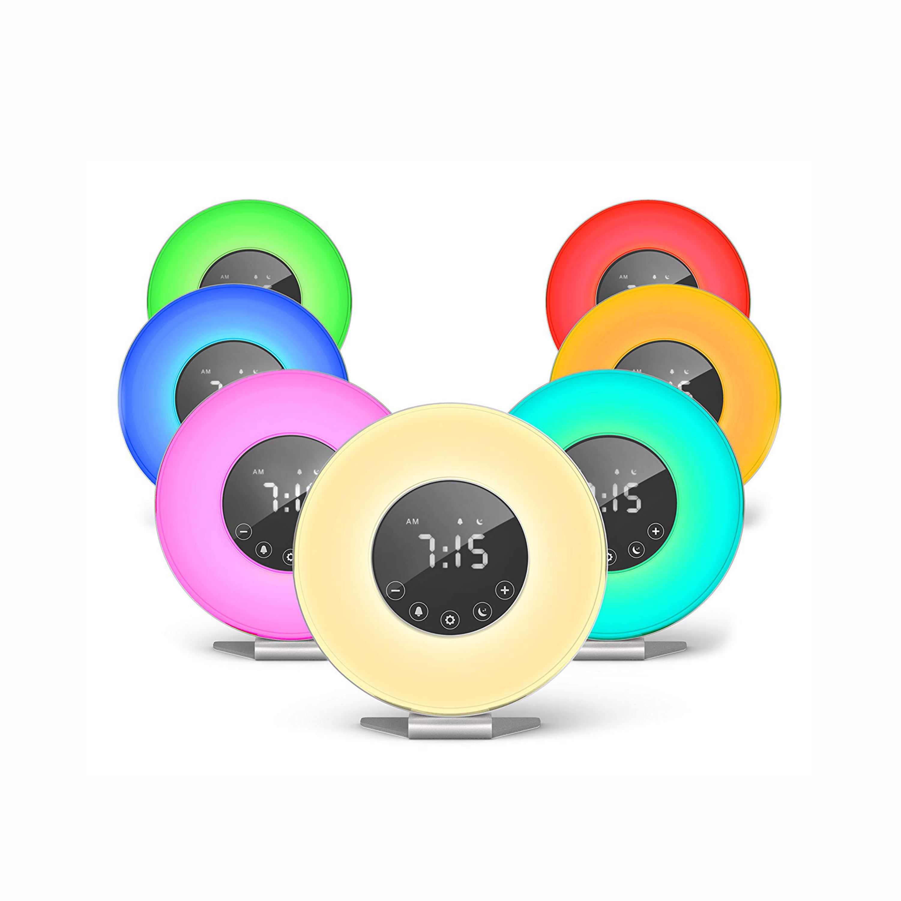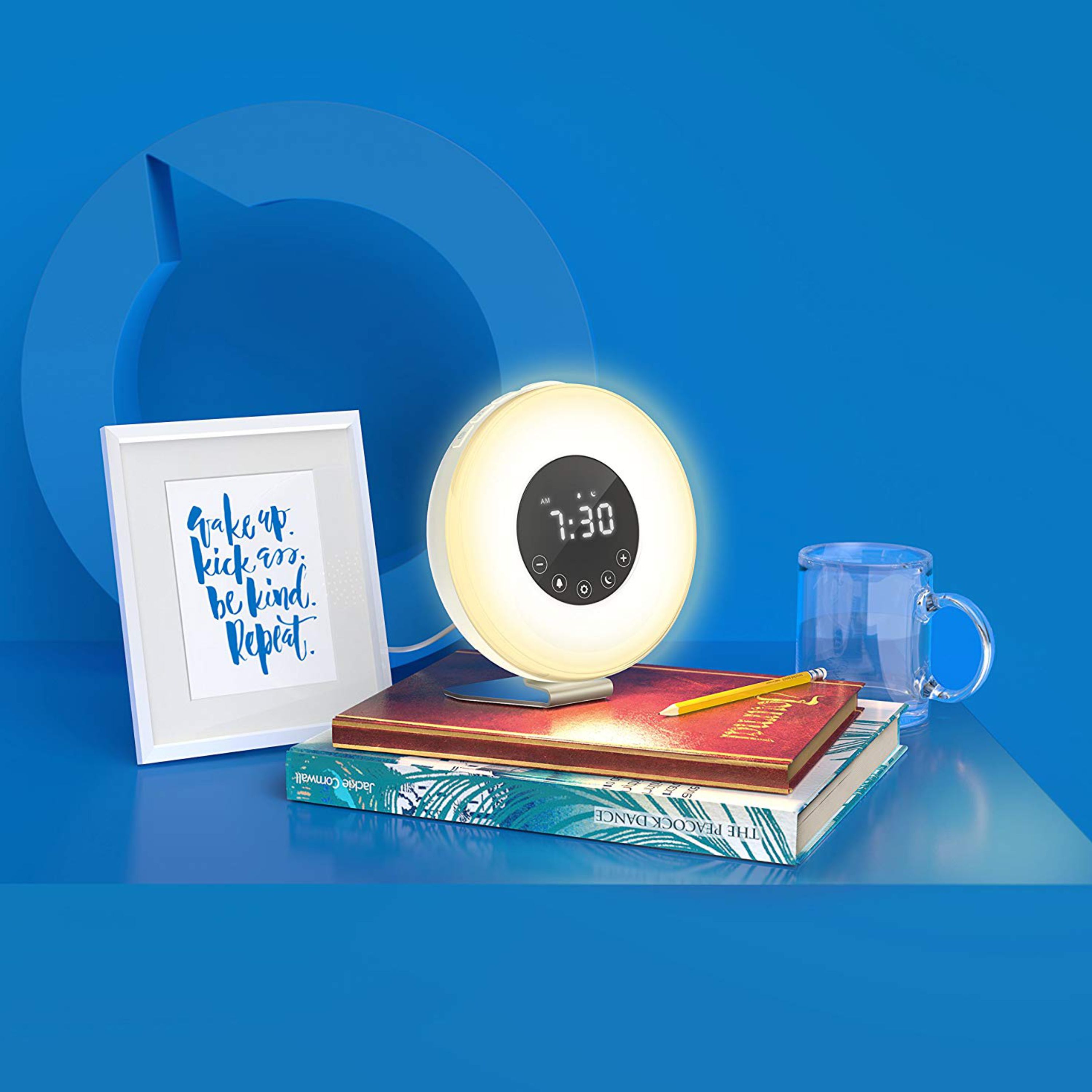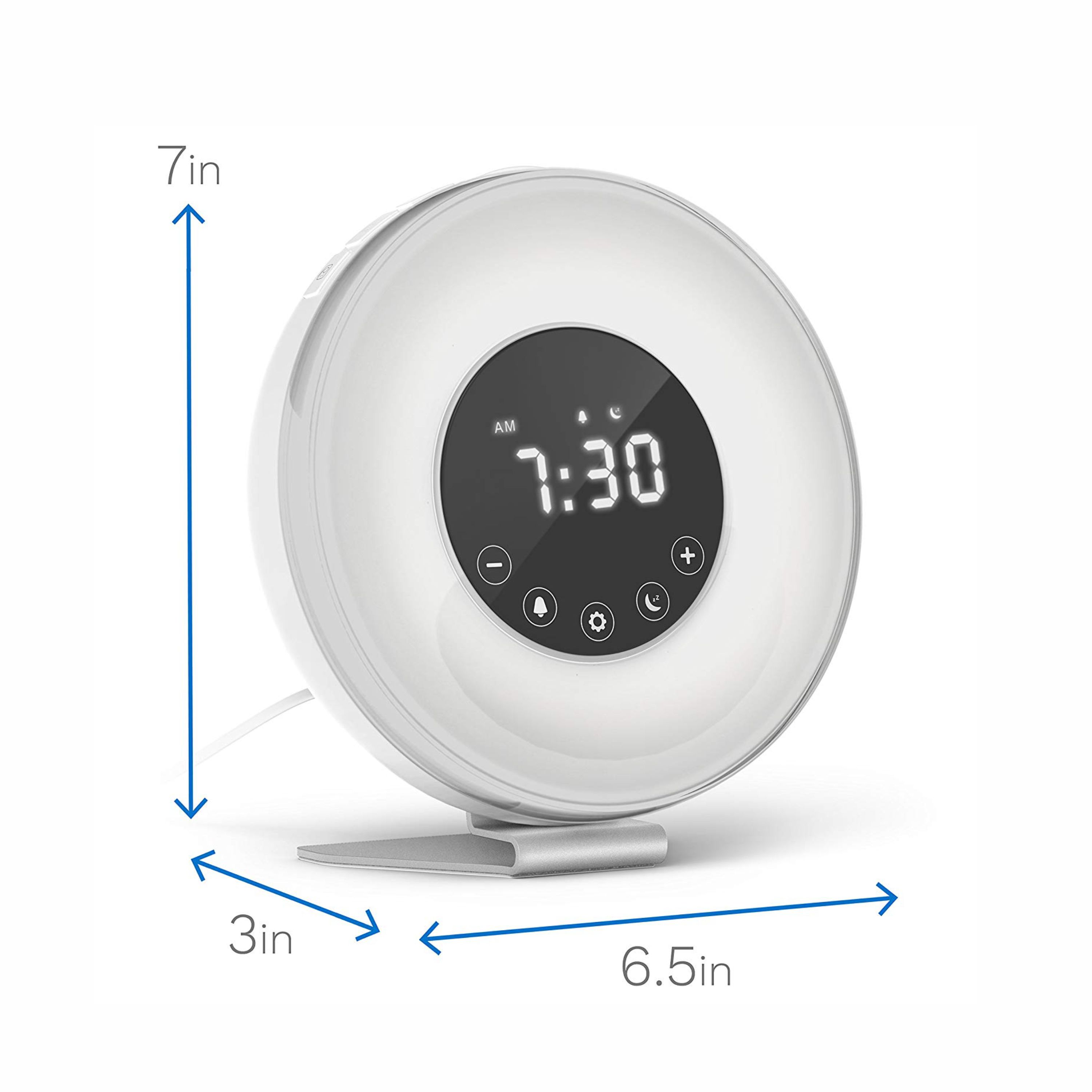 WAKE UP SUNRISE ALARM CLOCK - This alarm clock uses a warm LED light that gradually brightens 30 mins before the alarm time to gently wake you up. Features a Sleep timer with sunset simulation to gently dim the room and can also act as a night light