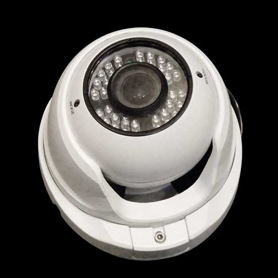 Displayed is a surveillance camera that features a metal dome for durability. Using infrared beams, this camera is sensitive and can be used in darkness. This useful surveillance camera is designed in a simplistic style in white and fits in your indoor decor easily.