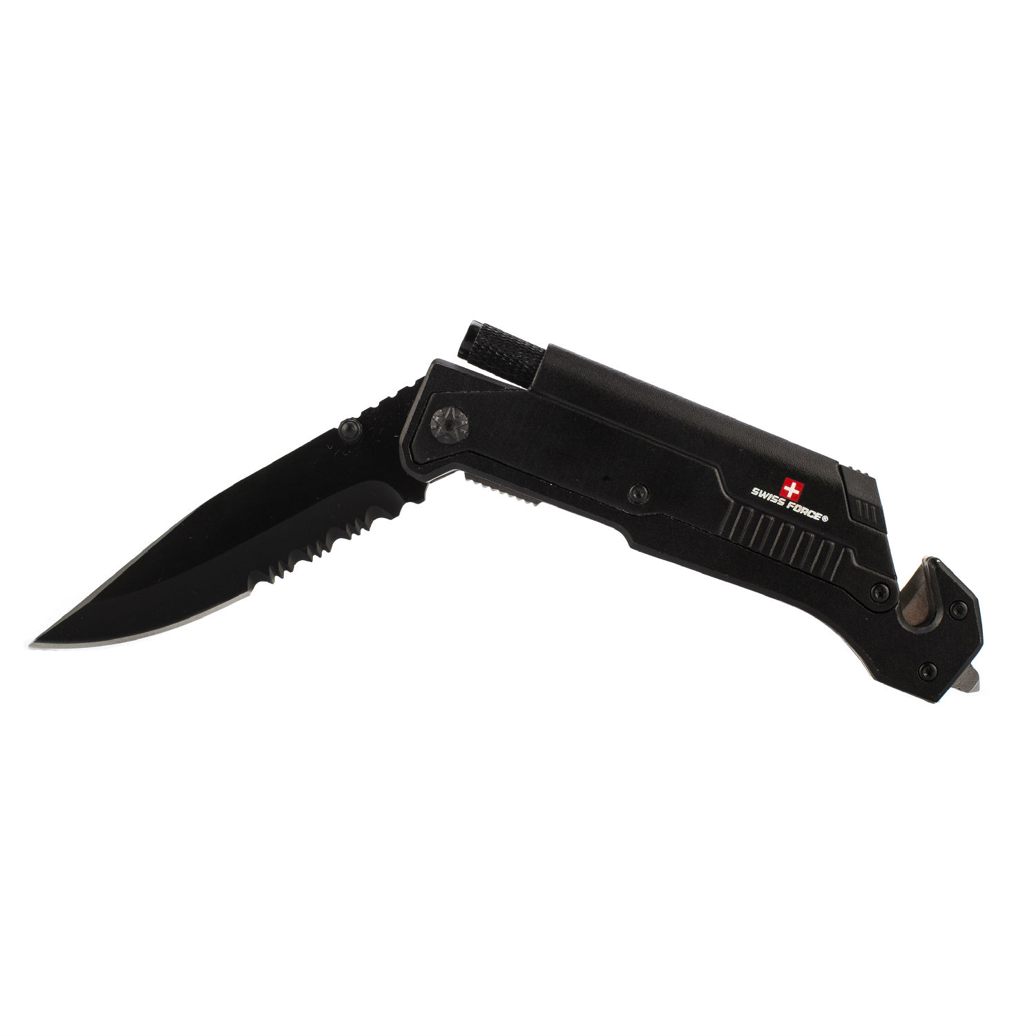Stainless steel knife with flash light and fire starter.