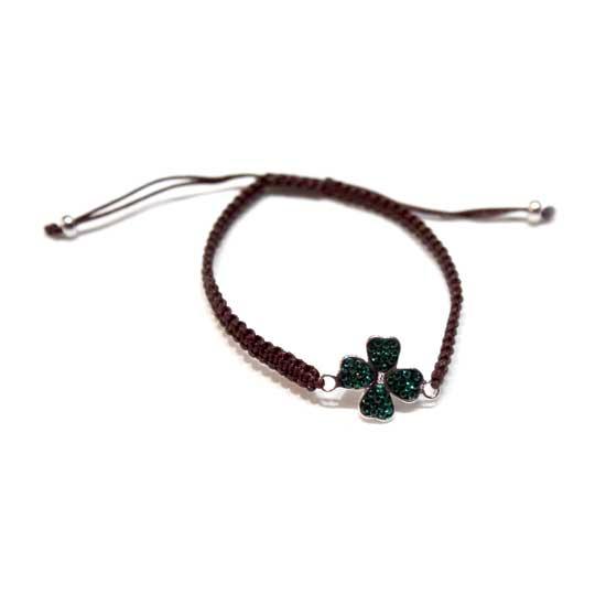 This brown braided bracelet is accented with a clover charm paved with green Swarovski crystals. The bracelet is perfect to accentuate your casual style. The length of the bracelet is adjustable.
