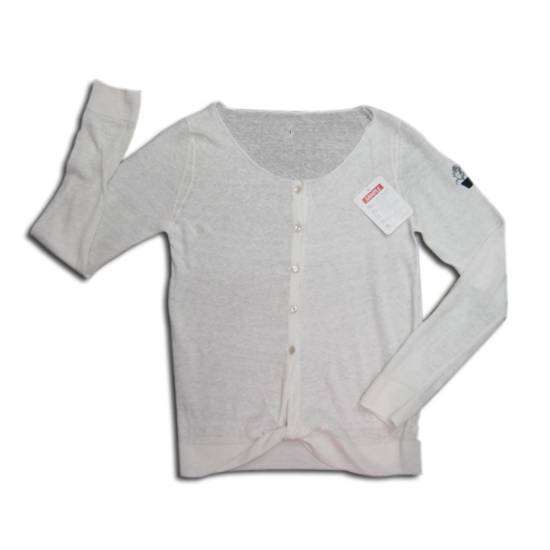 Featured here is a white sweater with a composition of 55% linen and 45% viscose.