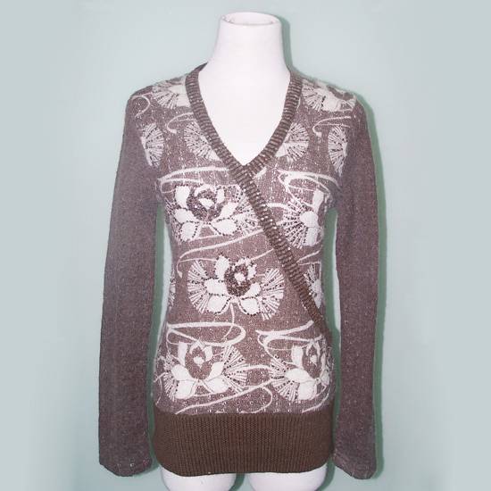 This is a sweater for ladies. It is designed with floral patterns all over. There is stripe patterns along the neckline.
