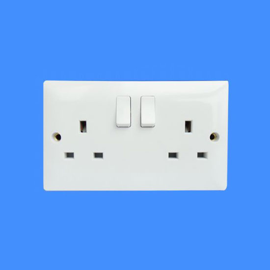 This is a switch socket with a sturdy panel in a rectangular shape. It features two outlets and two user-friendly buttons. With a smooth finish, this piece is easy to clean.