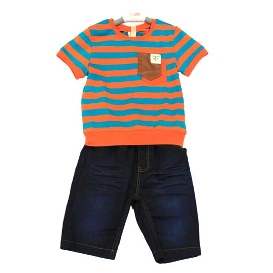 This is a kids’ wear set including a T-shirt and a pair of trousers. This boys' wear set is made of 95% cotton and 5% spandex for a comfort touch. The short-sleeved T-shirt is designed with striped patterns in bright colors for an attractive look.