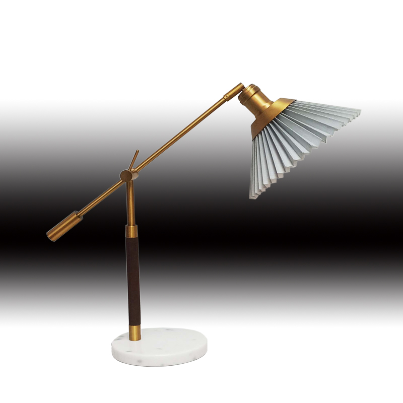 metal in brass via e-plating, ash in dark brown color, white marble, pleated linen shade in nature color