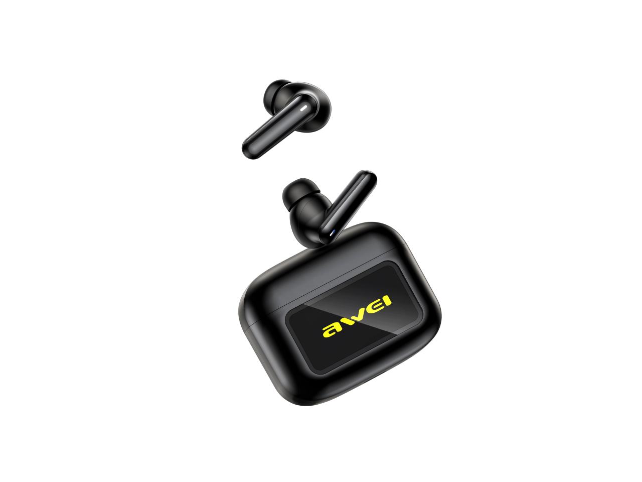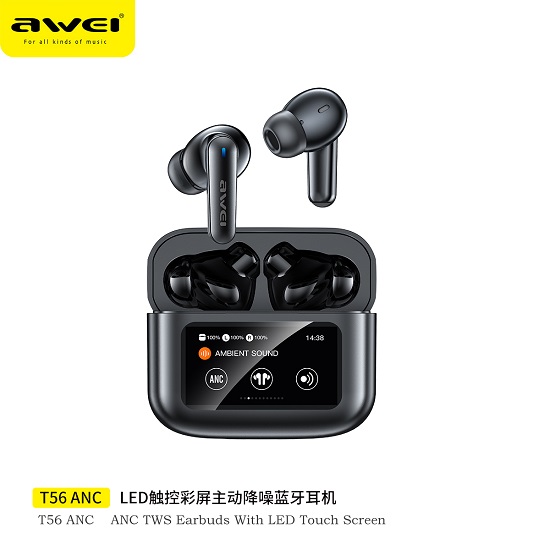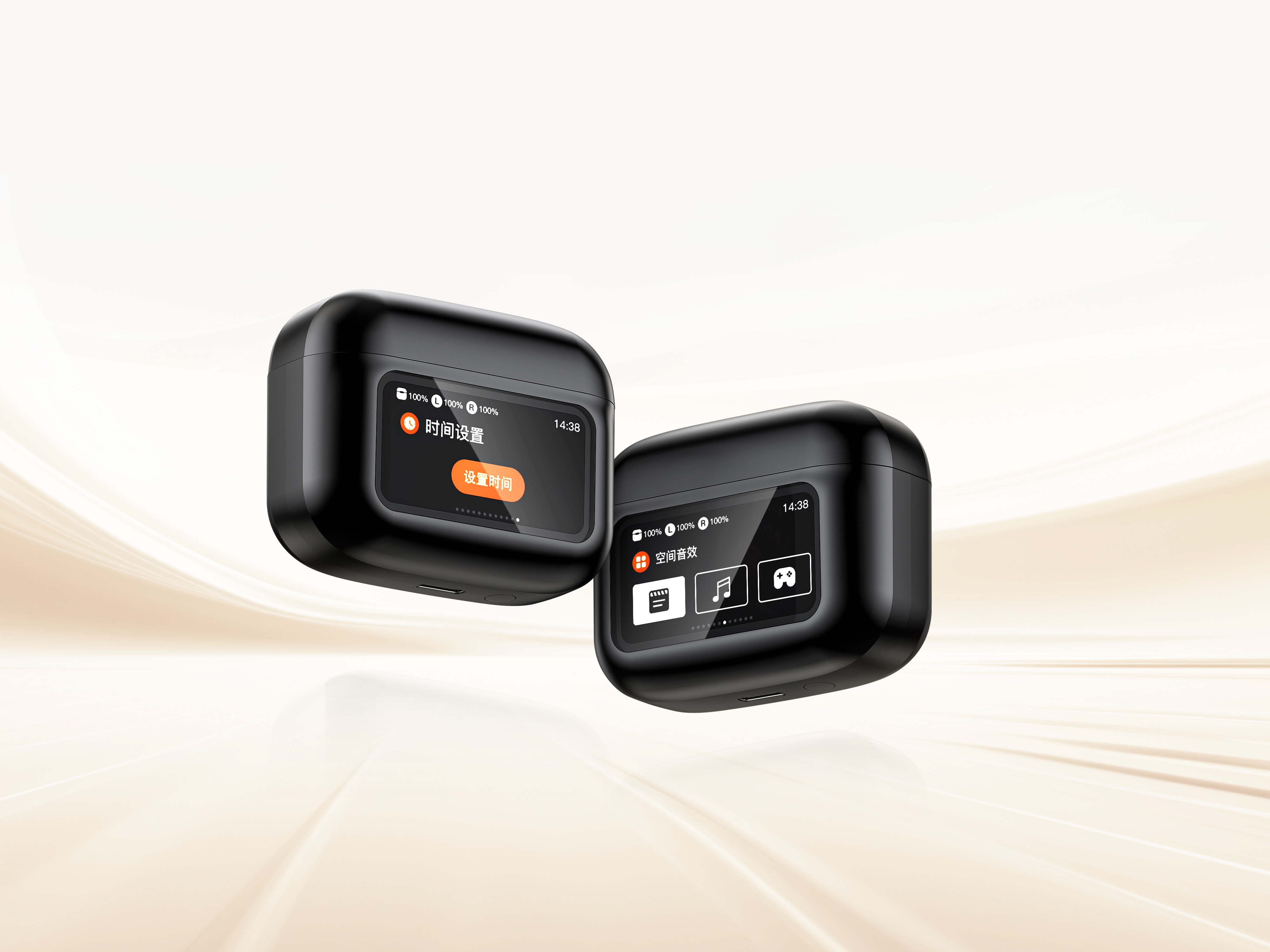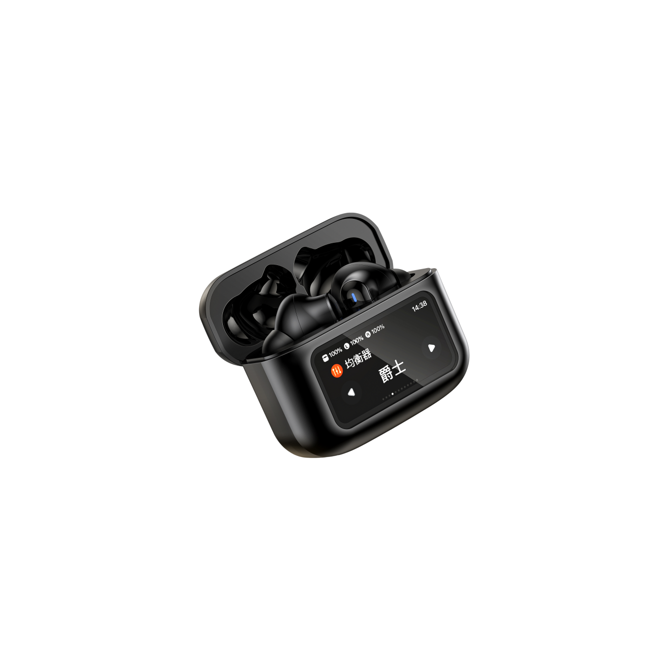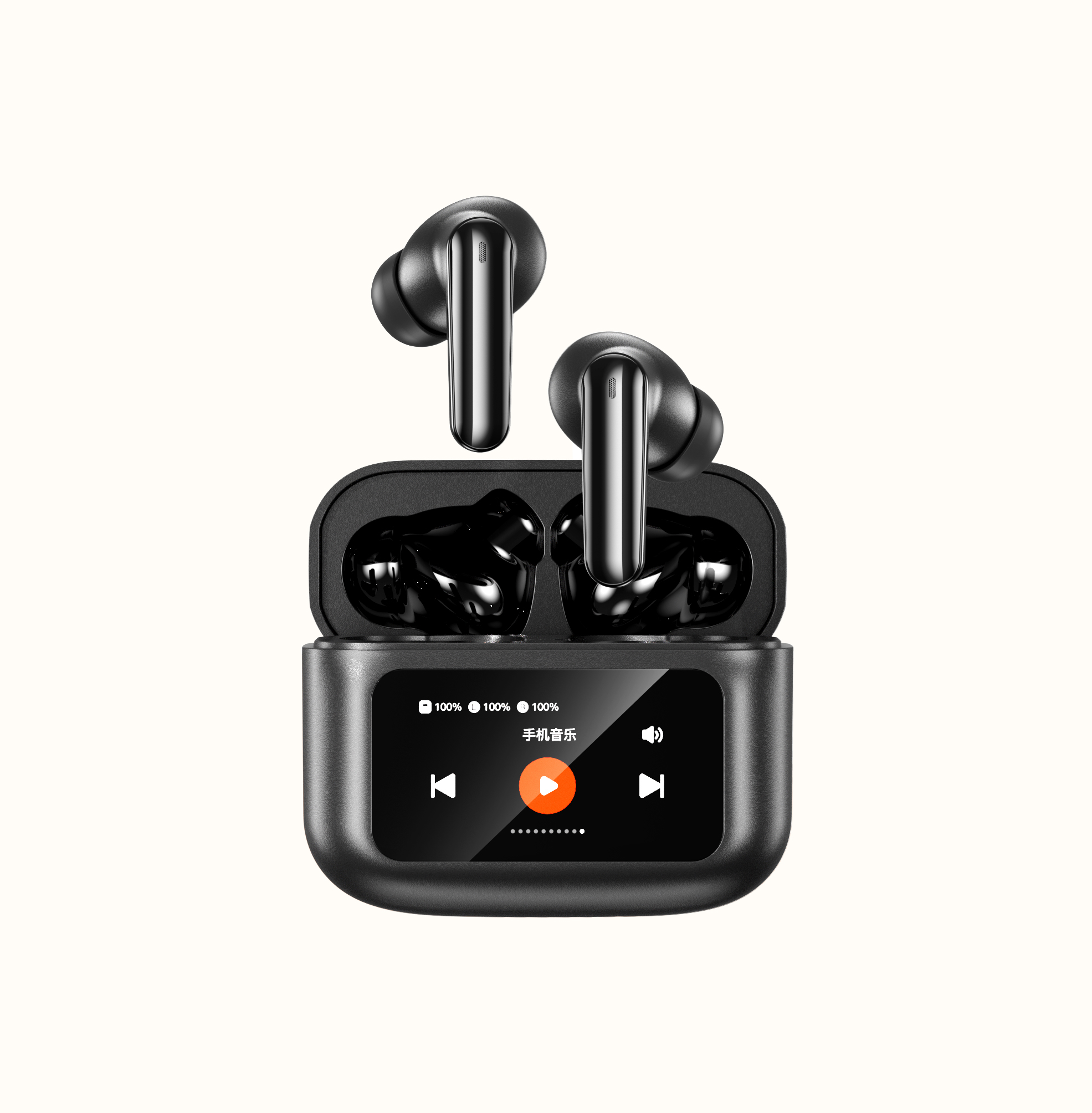 ANC TWS earbuds with smart screen in charging case, with noise cancelling