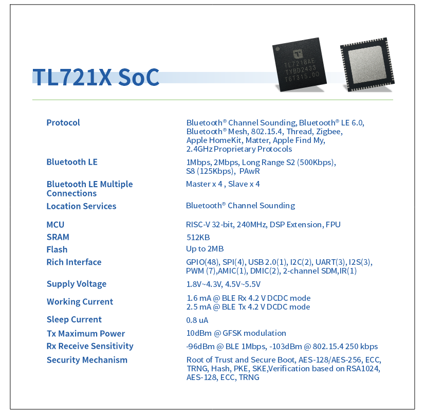 The TL721x is a single-chip SoC for Bluetooth® LE and 802.15.4. The embedded 2.4GHz transceiver supports Bluetooth® LE, 802.15.4, and 2.4GHz proprietary operation.The TL721x integrates the features and functionality required for high-quality wireless IoT devices into a single SoC.
