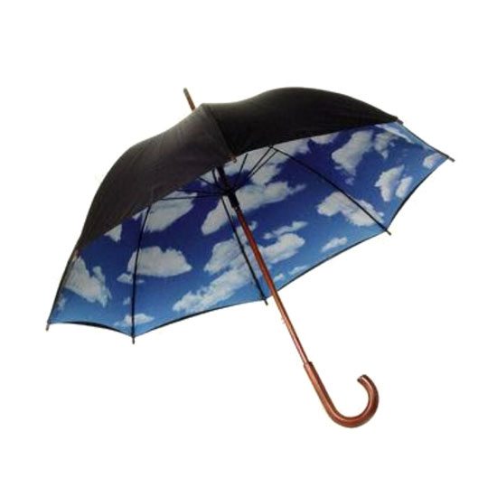 This is a TUPM umbrella with a durable frame. Its canopy features a black exterior and a printed interior with a blue sky and white cloud print. This stick umbrella is completed with a J-shaped handle in brown.