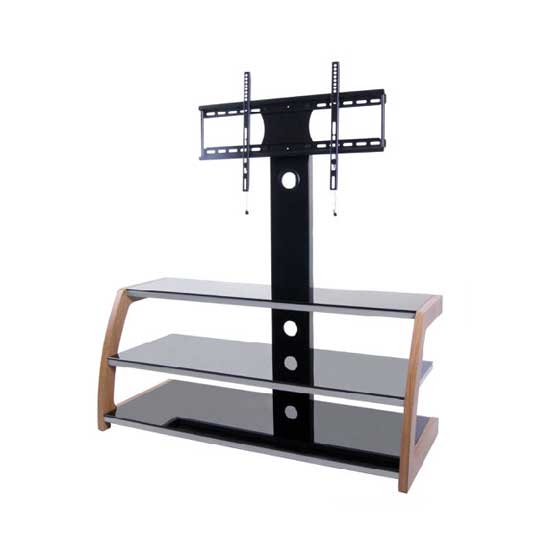 Displayed is a TV stand with a robust structure. Made of high quality material, this TV stand is strong and can support your equipment safely. This TV stand comes with many shelves for your convenience.