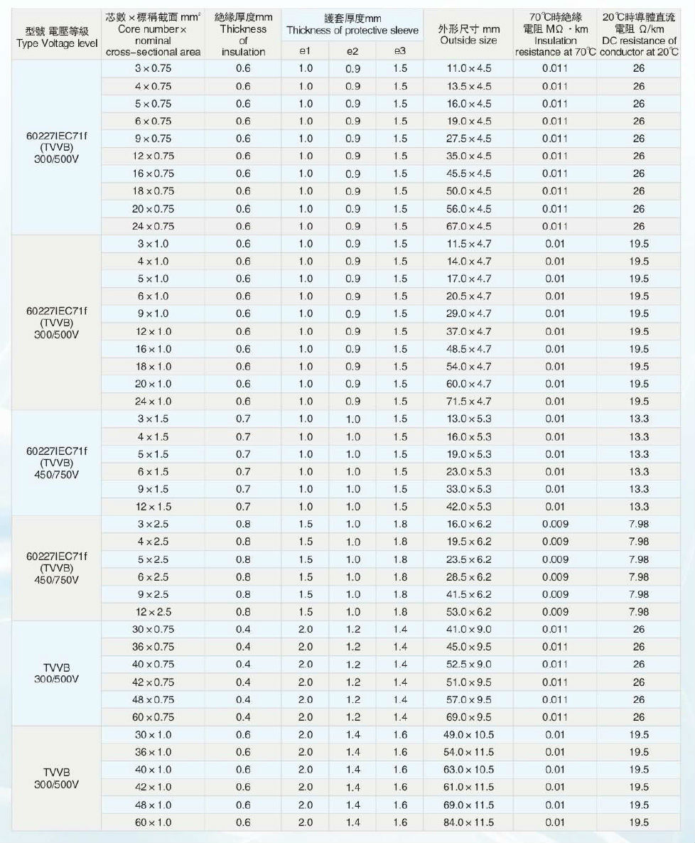 TVVB 300/500V 0.75~1.0mm2 (3~60)core