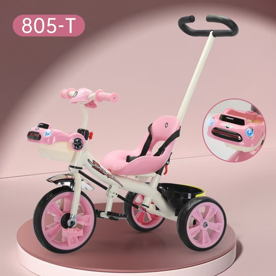 0.9mm thickened steel frame similar moto model, 0.8mm steel fork, safe and environmentally friendly handlebars, beautiful plastic wheel with EVA tire , more soft enlarged seats, one click installation, children tricycle with light and music, enlarged rear basket, matte baking varnish, anti roll setting
