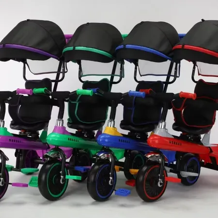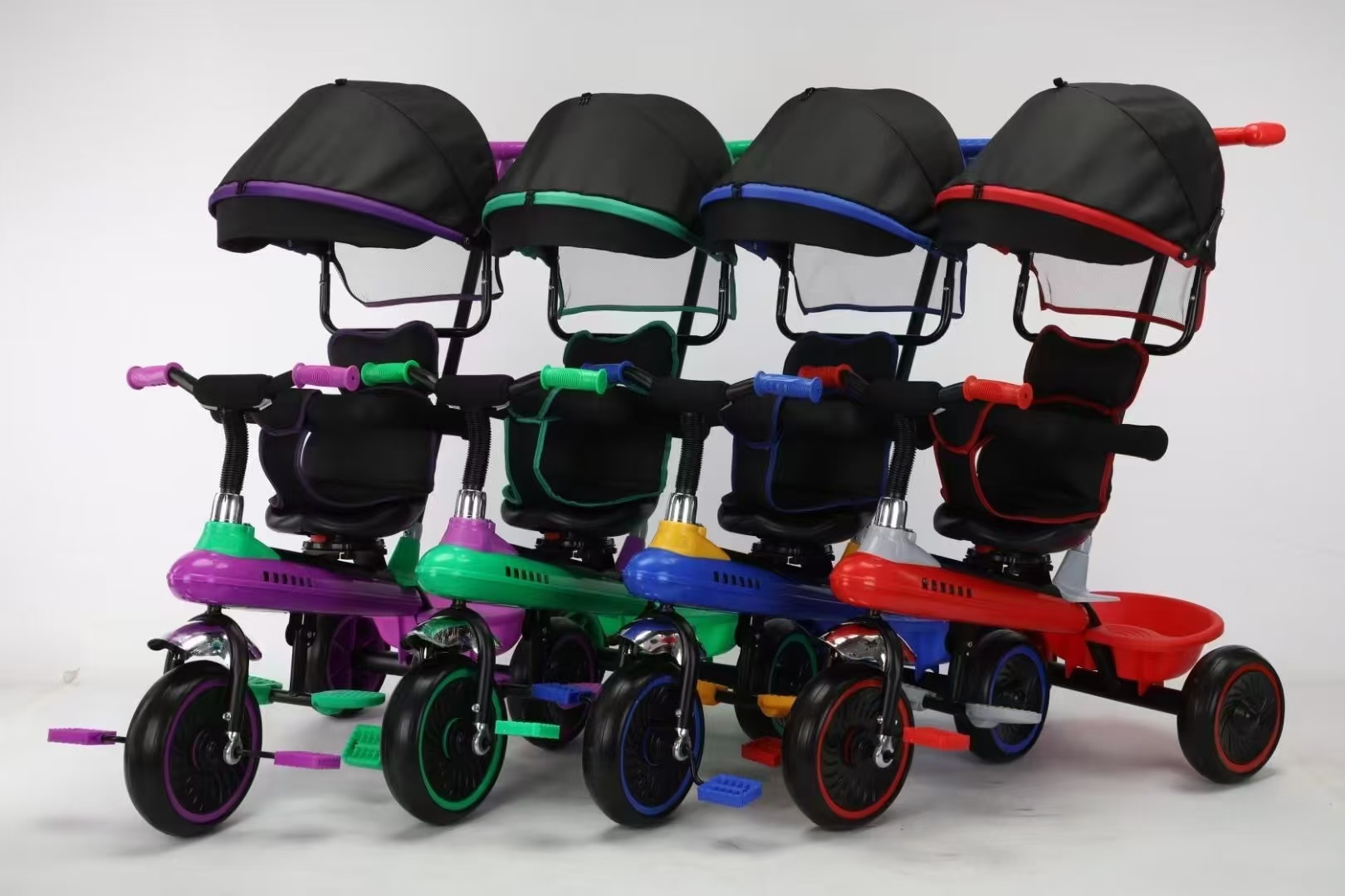 0.9mm thickened steel frame similar moto model, 0.8mm steel fork, safe and environmentally friendly handlebars, beautiful plastic wheel with EVA tire , more soft enlarged seats, one click installation, children tricycle with light and music, enlarged rear basket, matte baking varnish, anti roll setting