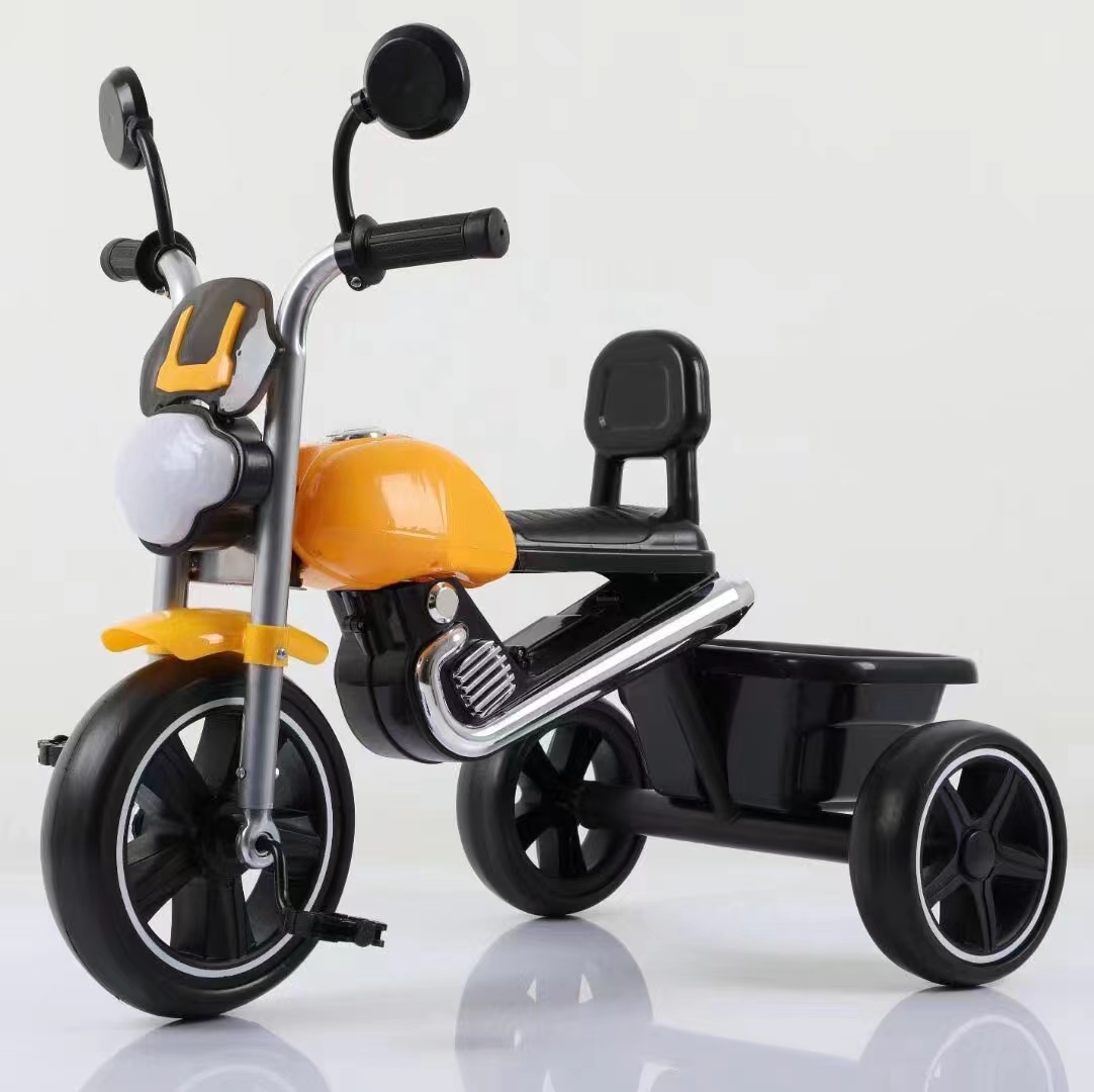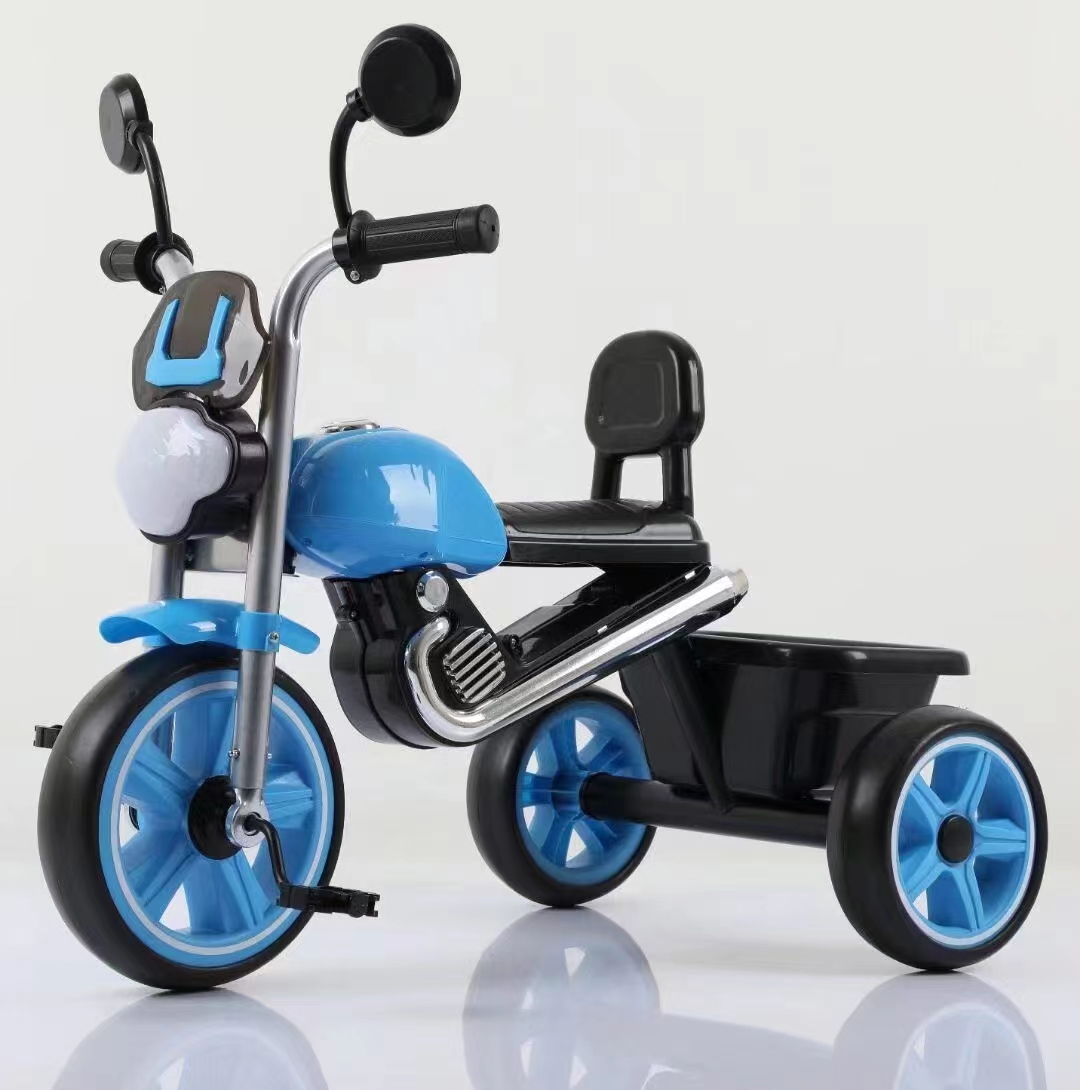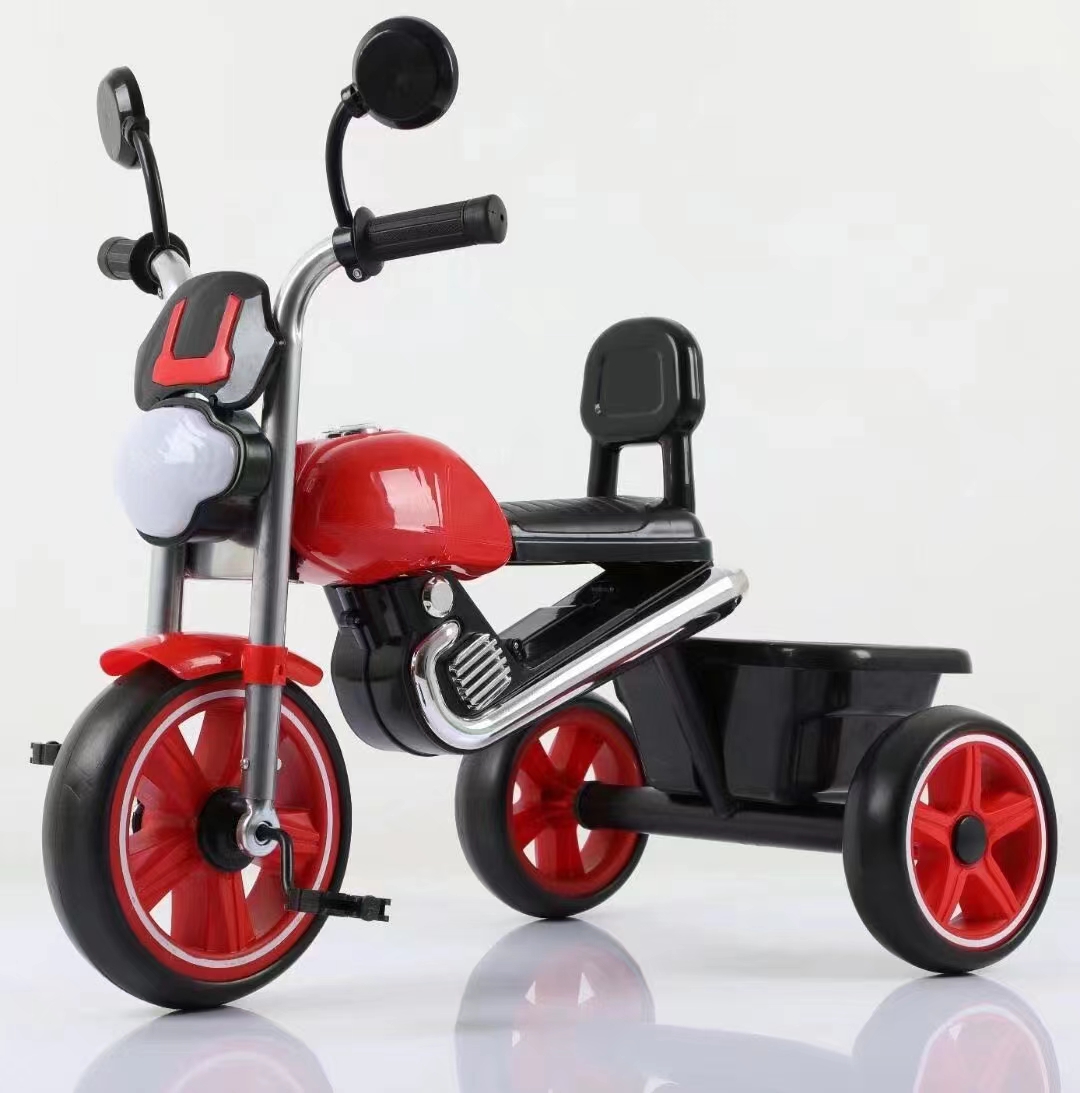 0.9mm thickened steel frame similar moto model, 0.8mm steel fork, safe and environmentally friendly handlebars, beautiful plastic wheel with EVA tire , more soft enlarged seats, one click installation, children tricycle with light and music, enlarged rear basket, matte baking varnish, anti roll setting