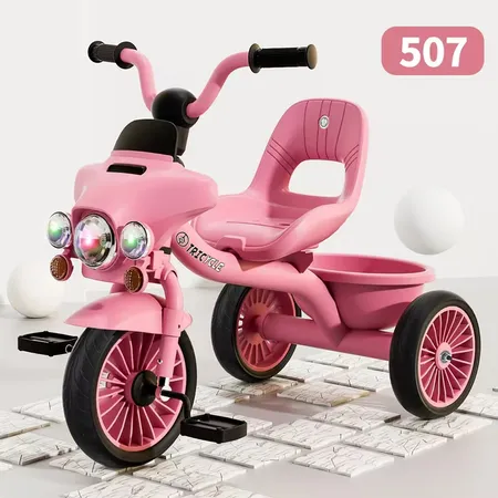 0.9mm thickened steel frame similar moto model, 0.8mm steel fork, safe and environmentally friendly handlebars, beautiful plastic wheel with EVA tire , more soft enlarged seats, one click installation, children tricycle with light and music, enlarged rear basket, matte baking varnish, anti roll setting