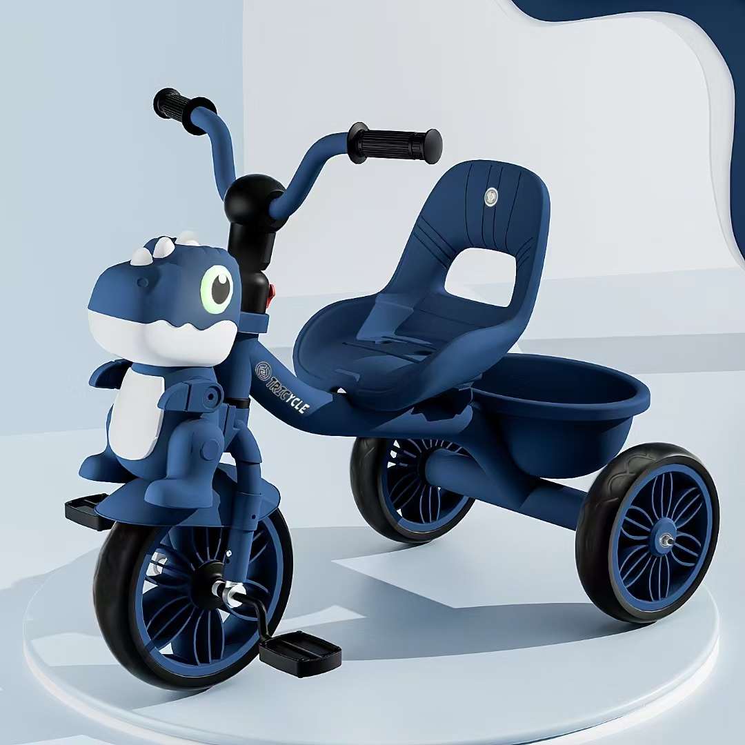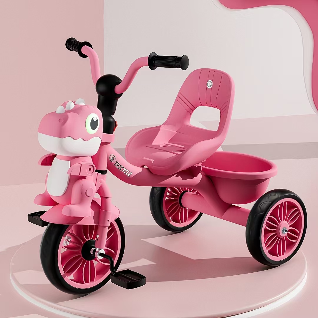 0.9mm thickened steel frame similar moto model, 0.8mm steel fork, safe and environmentally friendly handlebars, beautiful plastic wheel with EVA tire , more soft enlarged seats, one click installation, children tricycle with light and music, enlarged rear basket, matte baking varnish, anti roll setting