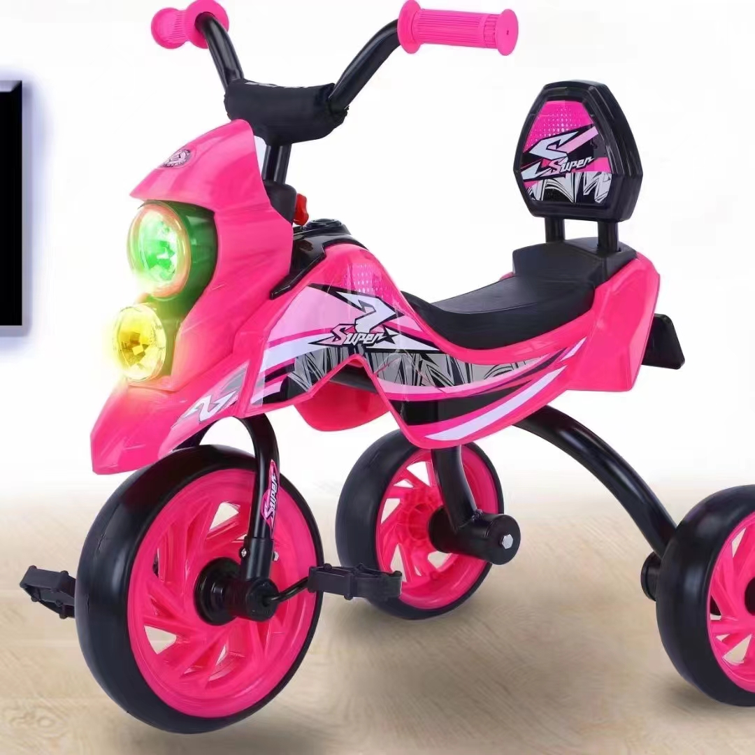0.9mm thickened steel frame similar moto model, 0.8mm steel fork, safe and environmentally friendly handlebars, beautiful plastic wheel with EVA tire , more soft enlarged seats, one click installation, children tricycle with light and music, enlarged rear basket, matte baking varnish, anti roll setting
