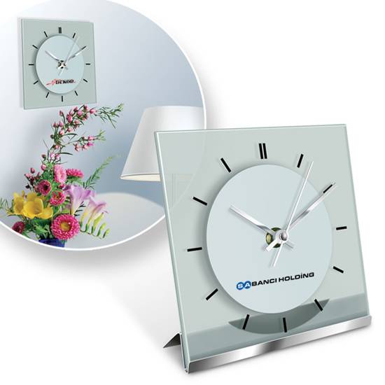 The table clock has a flat bottom which can stand firmly on the table. The body of the clock is made of glass. It has hour, minute and second display. It can be wall mounted.