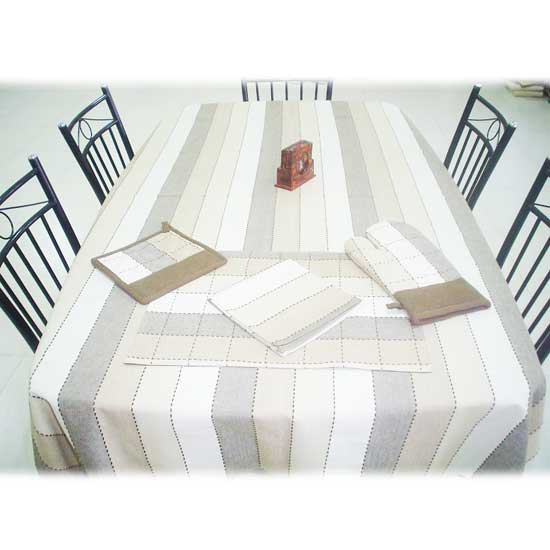 The displayed table cloth in natural colors features wide stripe patterns for a stylish touch. It adopts a high quality material to ensure sturdiness. There are assorted designs available for your selection.