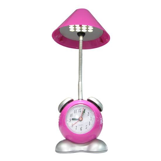 This is a modern table lamp consists of a LED lighting part and an analogue alarm clock connected with a movable handle. The lighting direction can be adjusted by bending the flexible handle. The innovative LED desk lamp comes in various colors and designs.