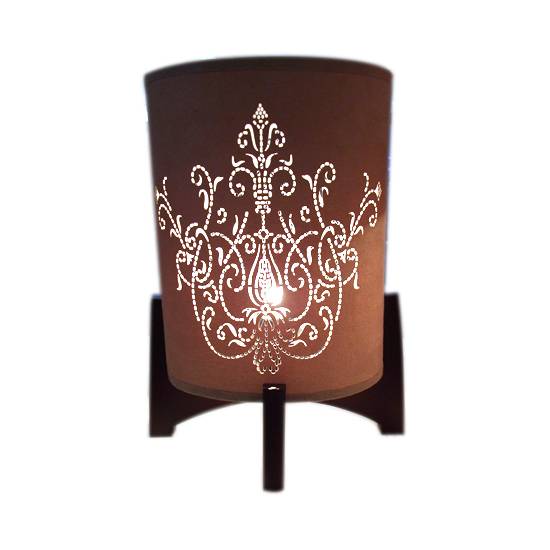 A table lamp with a cylindrical lampshade. It has a laser cut out see throught design on the lampshade. This allow light to be shone through to give a soft light ray.