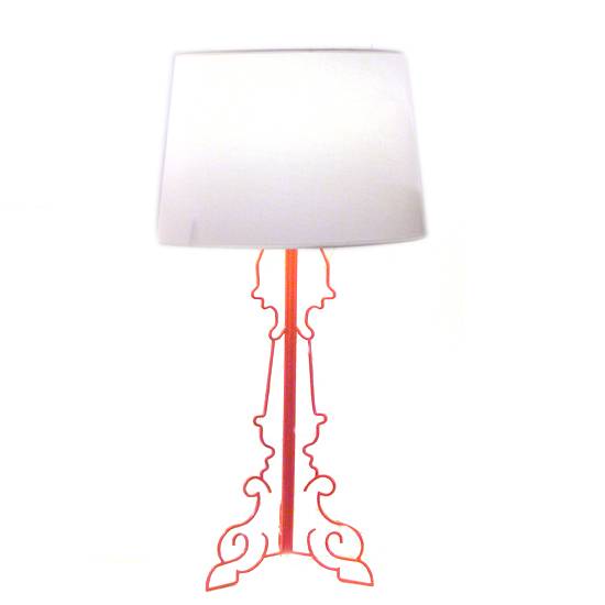 As shown is a stylish desk lamp with a plain design. It comes with a red plastic made stand. The semi-transparent shade avoids glare.
