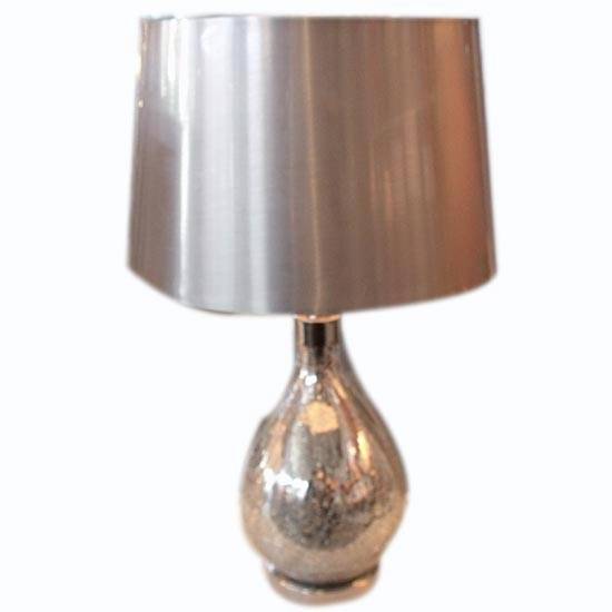 This is a table lamp in a stylish design. It boasts a bell shade and a raindrop lamp base in sleek, silvertone finish, adding a touch of unique glamor to the entire design. This table lamp will bring brilliant elegance to your home decor.