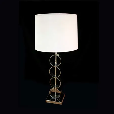 This table lamp features a clean white drum lampshade. It is complemented by a silvery stand that consists of a chain of cut-out circles, evoking a sense of vogue. The minimalist lamp is finished with a square base that can stand on any flat surface firmly.